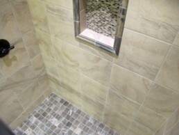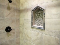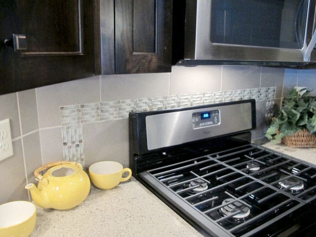 The kitchen backsplash was put together using Thompson Tile & Stone’s Kelly tile in a 10×13 size with the color, grey. To accompany the tile and give a focal point, we inlayed a weave mosaic that is also three dimensional. The mosaic is called Beveled Convex Glass also in the color grey.