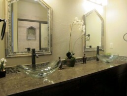 The master bathroom is stunning and completely custom. The main backsplash on the vanity from Statements Distinctive Tile & Marble, is a micro brick mosaic called Pearl in color, desert. The reoccurring sequence of the cathedral styled arches are dramatically framed by this same Pearl mosaic. Behind the vanity stands a gorgeous walk in shower with a Danya 3×3 mosaic tile floor in color, Basin and the walls are Mannington Tile, Catalina in color, Sand Dune.