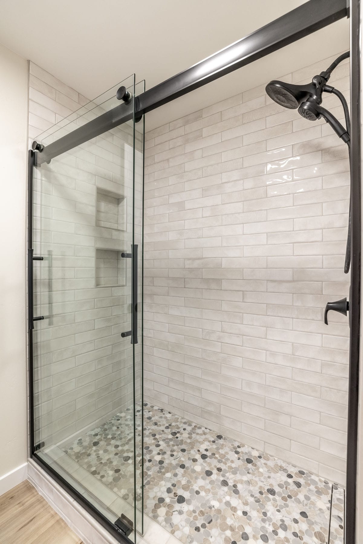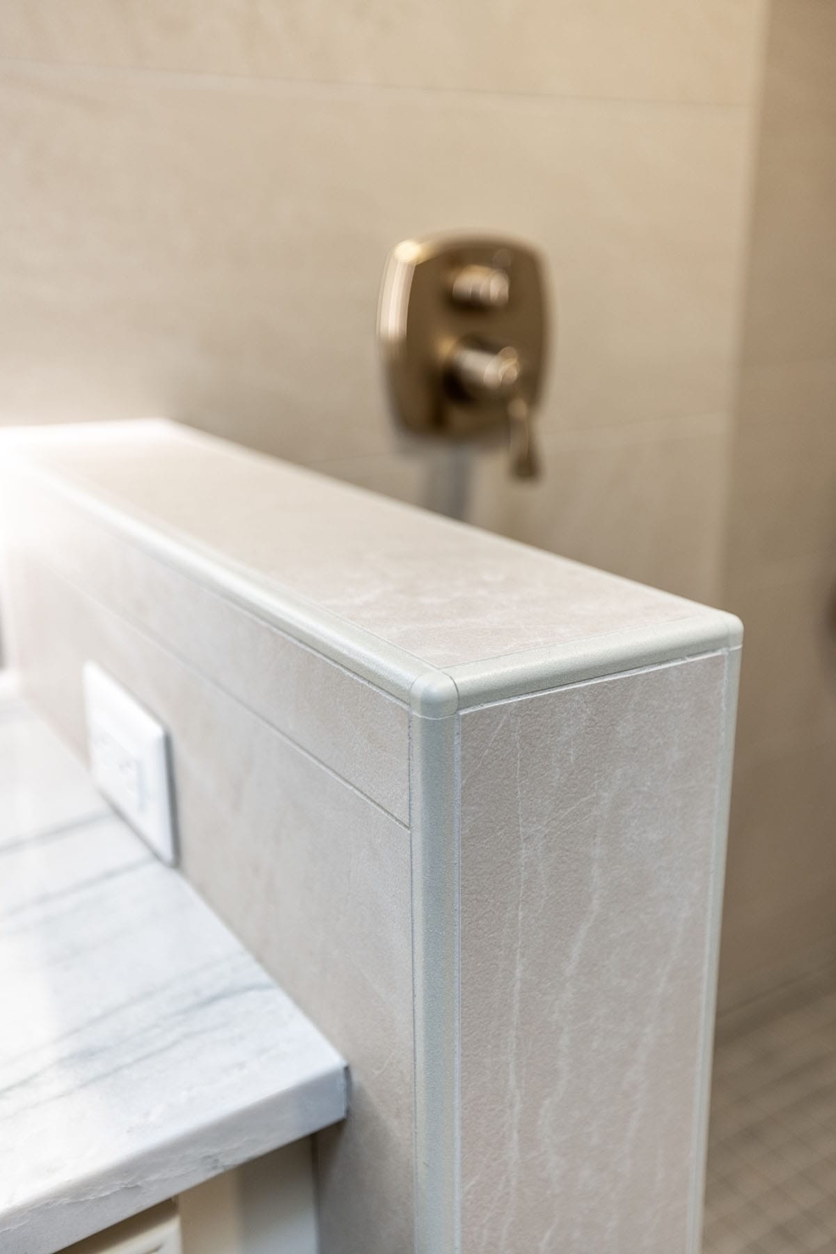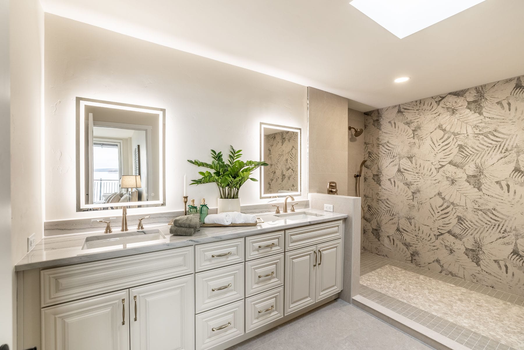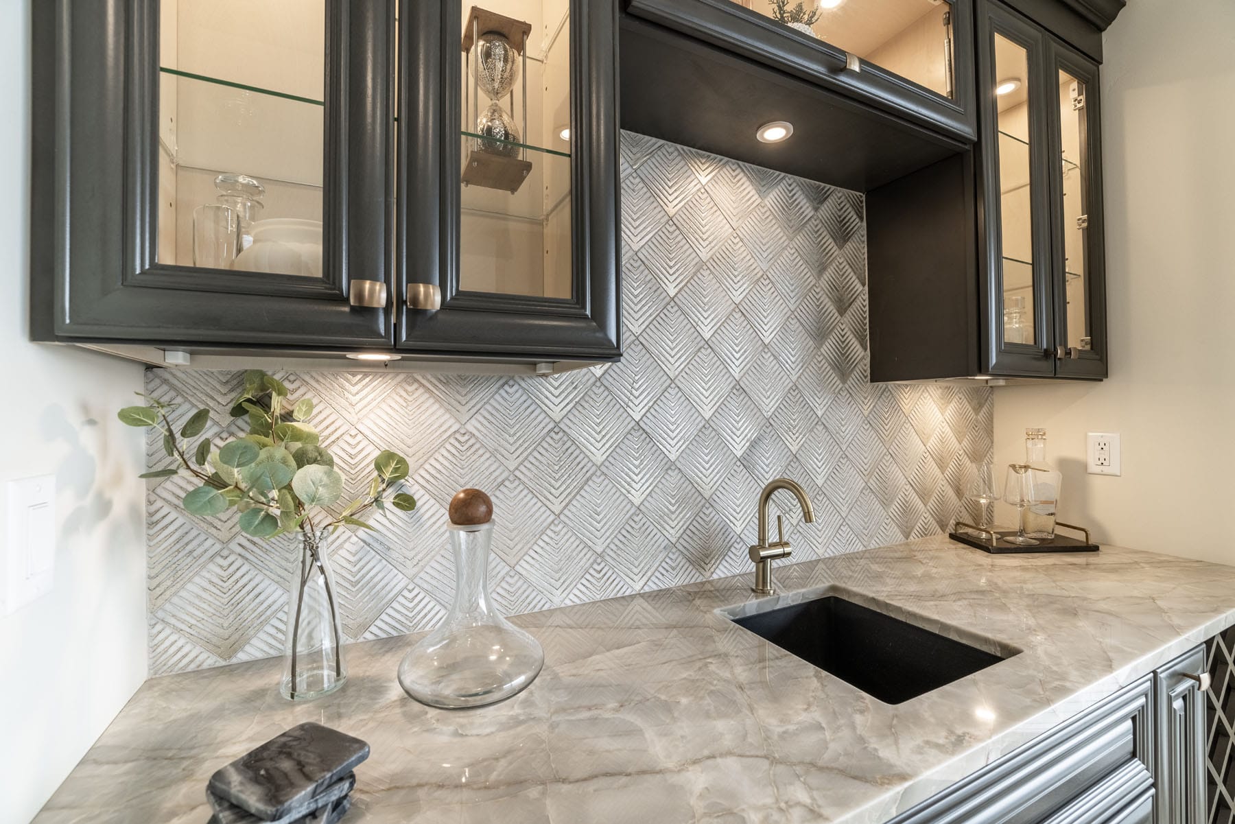 Tile selections play a starring role in the redesign—from the textured, geometric backsplash in the bar to the spa-inspired bathrooms featuring bold, large-format patterns and elegant walk-in showers. Each surface was chosen to enhance both visual appeal and long-lasting performance.