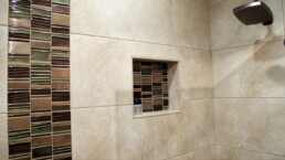 Contemporary walk in shower with 12×24 Kensington Beige tile on the shower walls. Daltile Acacia Valley 6×36 in Ridge wrap a pony wall that seamlessly supports a rain glass partition that combines sensational privacy and style. Drama was added with a gorgeous glass and metal mosaic mix running top to bottom in a single band. Corrugated Series by Glazzio Tiles in Ginger Clove was used as this band and in the built in niche.