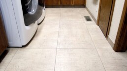 Large format 20×20 Khadi tile in Beige are installed on the laundry room floor reinforcing an earthy vibe. They almost appear to look like cork!