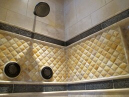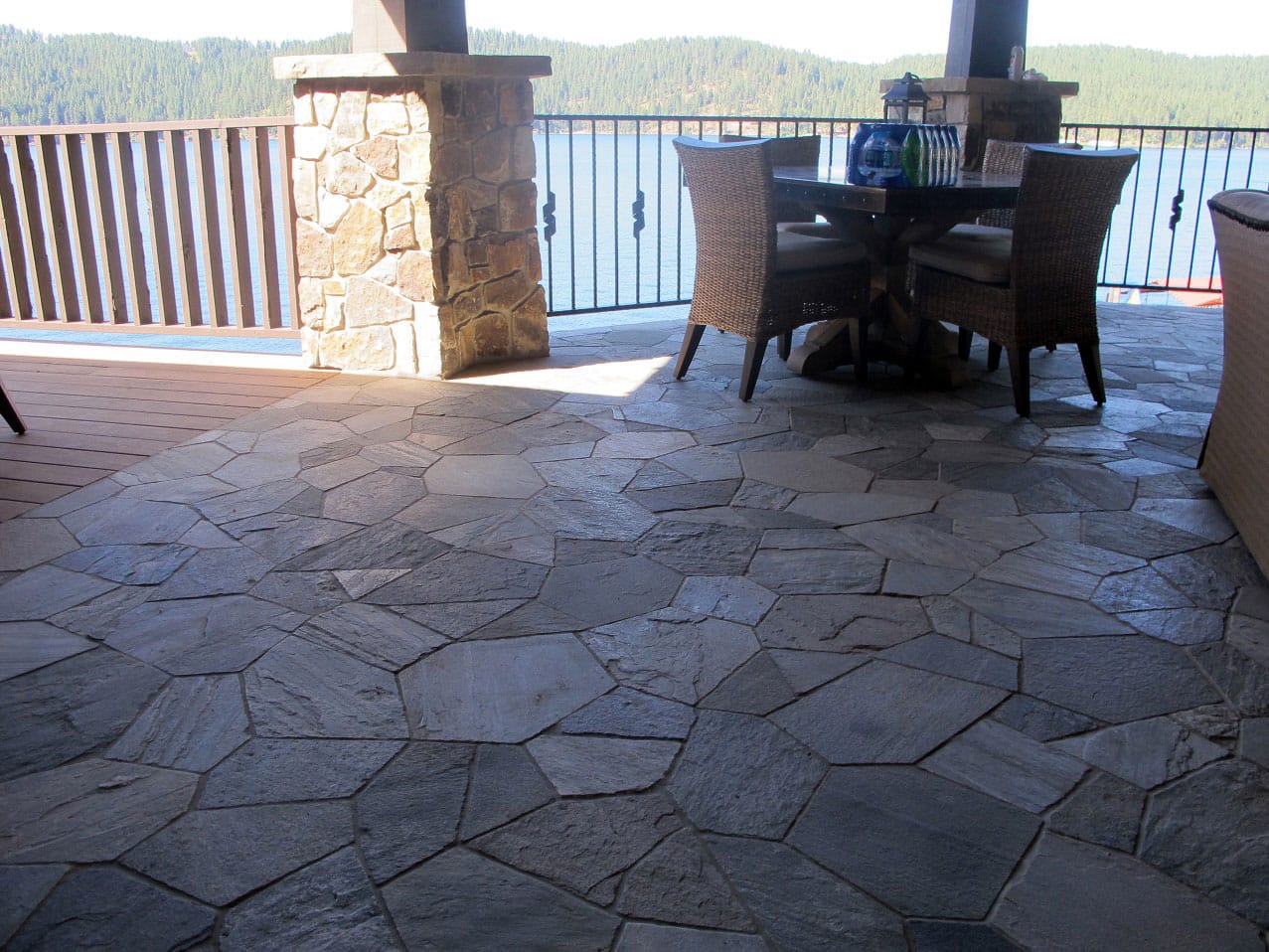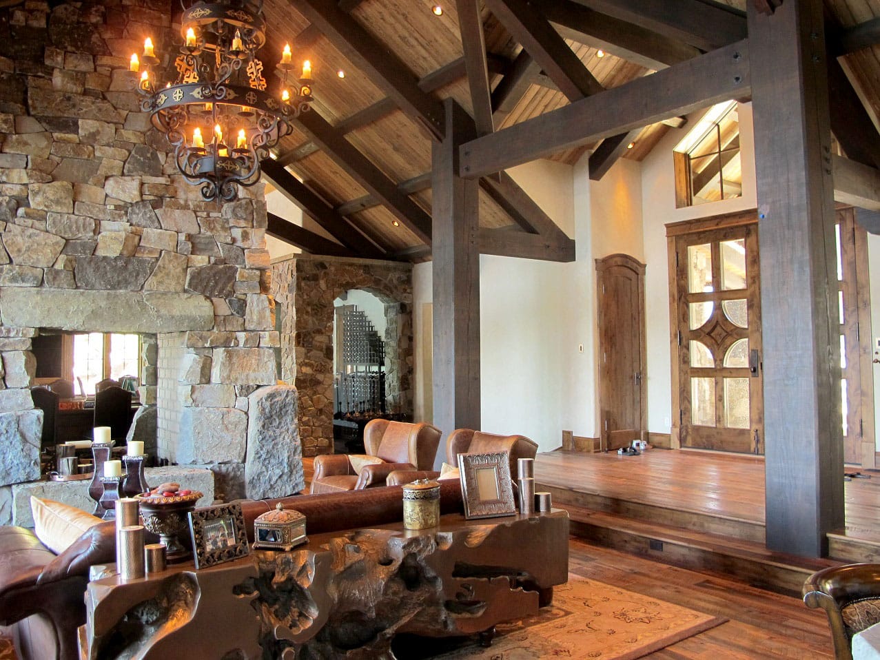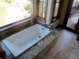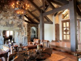 Old world charm meets rustic elegance with this beautiful home situated on beautiful Lake Coeur d’Alene. In correlation with Edwards Smith Construction, we were able to design a space that was comfortable yet sophisticated for the homeowners. Large beams and the massively extensive hardwood floors tie the main floor together giving you a dramatic first impression. Expansive views of Lake Coeur d’Alene from the multiple decks and patios bring the outdoors in and allow for a great entertaining space. The kitchen was a challenge. We pulled old world elements into the backsplash and above the range to coexist seamlessly together. The hood is spectacular and was carved out of limestone leading your eye up to the 16 foot ceilings. The main hall transforms itself to a gorgeous master bedroom suite with a bathroom that boasts everything polished onyx. Downstairs there are three other bedrooms all with an attached on suite. A wet bar and recreational room is the initial feature that welcomes you to the basement level. Natural light saturates the space while rich woods and decorative moldings give it an intimate feel. A powder room at the base of the stairs leaves a lasting impression. Rhomboid stone tiles are chosen to mimic the shape of the mirror above the vanity. Landscaped to perfection and an added guest house for extra company, you may never want to leave.