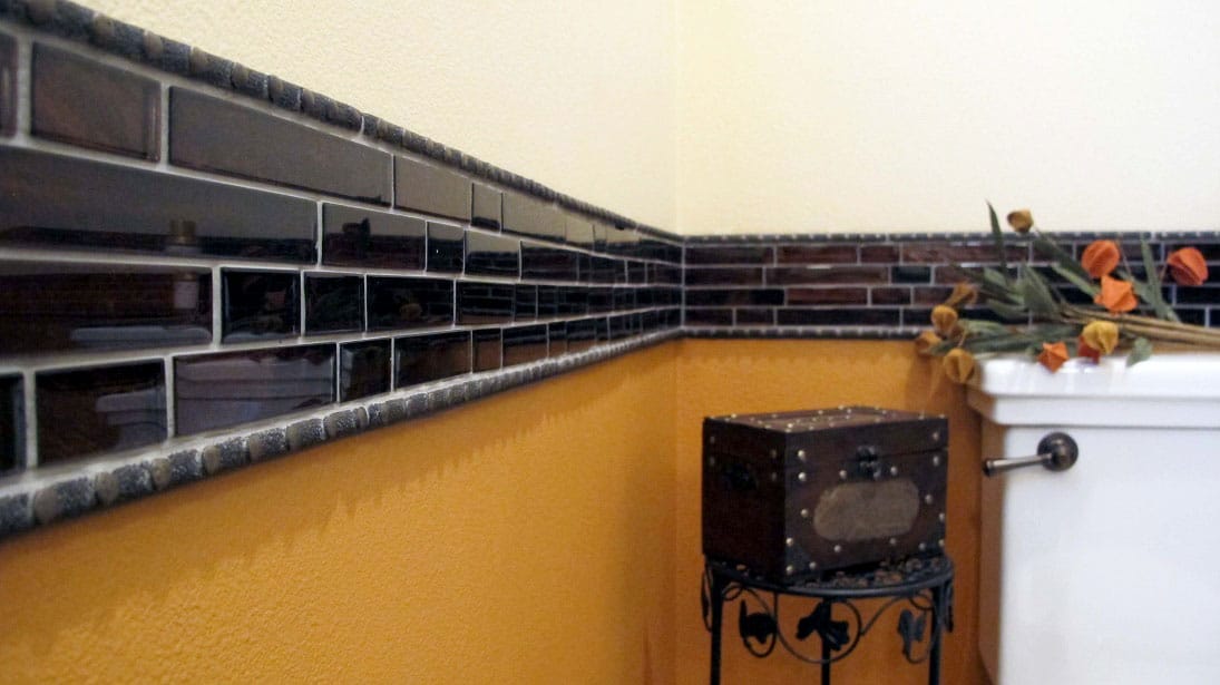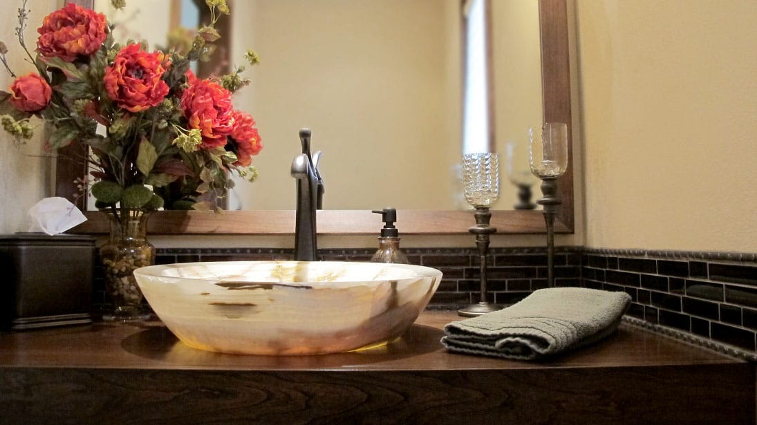 Next to the kitchen hides a simple and elegant powder room complete with a natural onyx vessel sink! The sink is illuminated and is finished with a brushed antique bronze faucet. The countertop is adorned with Dal Tile’s Tiger Eye glass mosaic backsplash in color, Java. Wrapping around the entire room, this backsplash translates into a wainscoting which gives this bathroom a custom look.